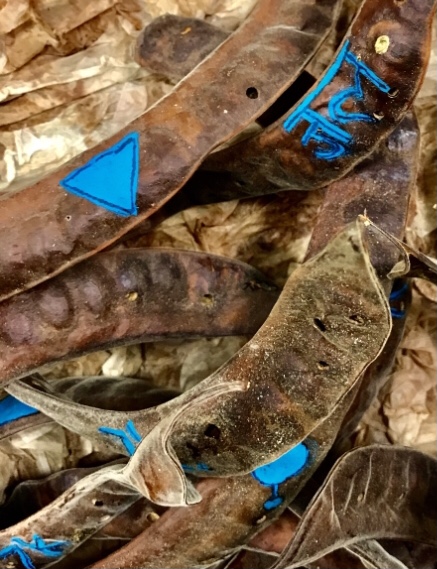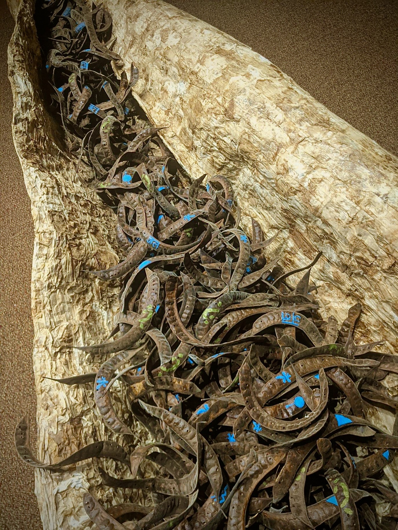 Detail of Water, falling… Cellulose (brewed tea paper) over a skeletal frame. Pod filled with tree pods painted with one of five symbols for water. Visitors to the gallery were offered to take pods home with them.