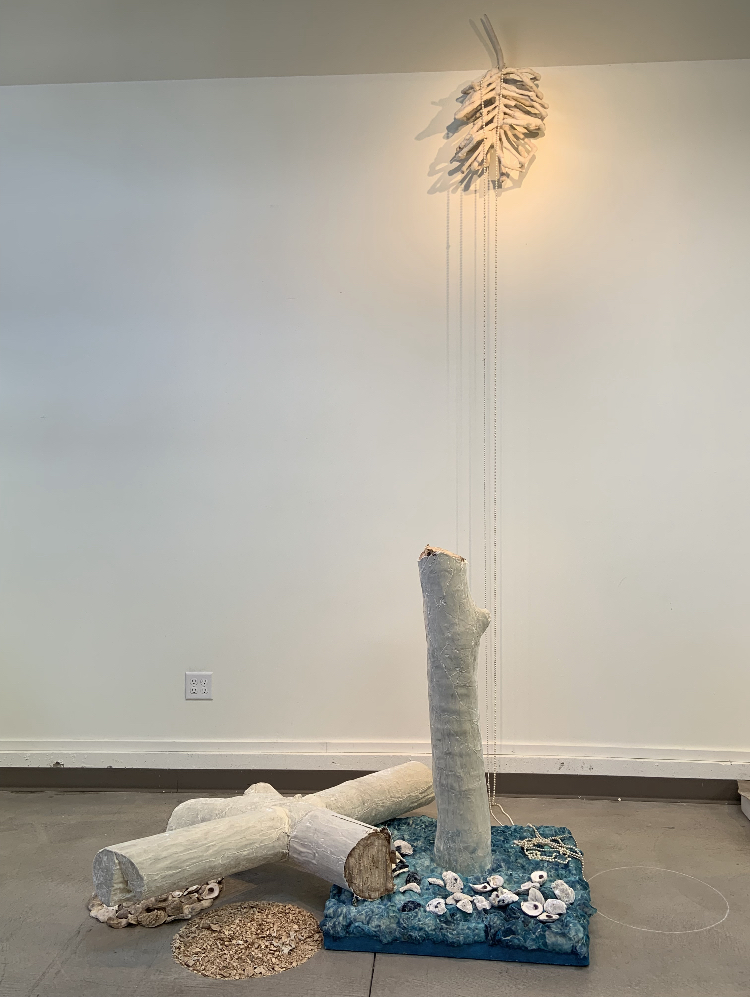 A detail of the base. The cross itself is skinned in white velvet (as is the ribcage suspended on the wall behind the sculpture). The base is also skinned in white velvet that has been stained with blue acrylic water color.