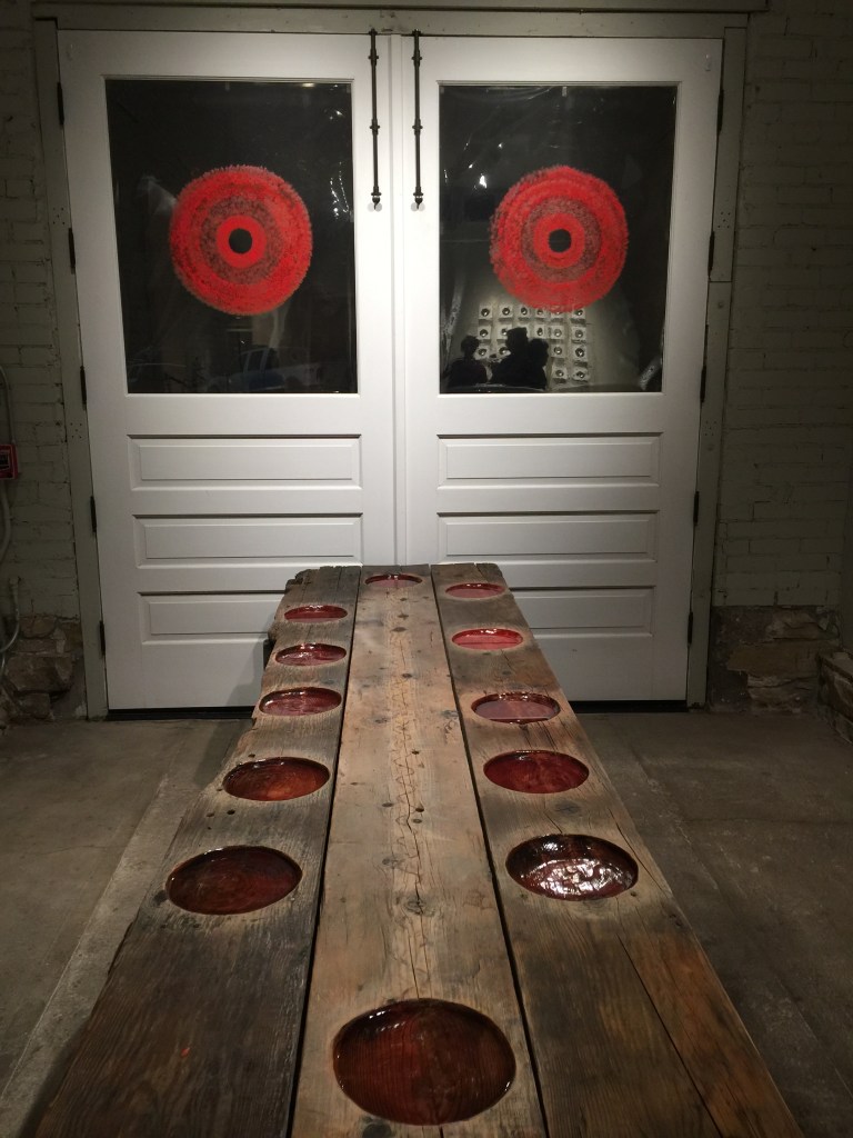 This gallery view of PLEASEtouch shows 2 of the 3 islands from my installation ‘skin’ (2001) in the foreground – Oahu (on the left) skinned in vintage army uniforms and a bit of Honshu (on the right), skinned in army uniform linings. Bundled above them, some of the yellow “silk” Battle Banners from the installation. Left, along the wall, artifacts (branches skinned in black leather) from an installation created for the Rocky Mountain College of Art and Design called Landscape for an Institution of Higher Learning (2002). In the back, two new works: Castle Bravo (on the wall), a painting” of pipe cleaners on aluminum foil-skinned canvas, and the small silver figure on the pedestal is called Disc Pilot, based on a Hopi Katsina story.