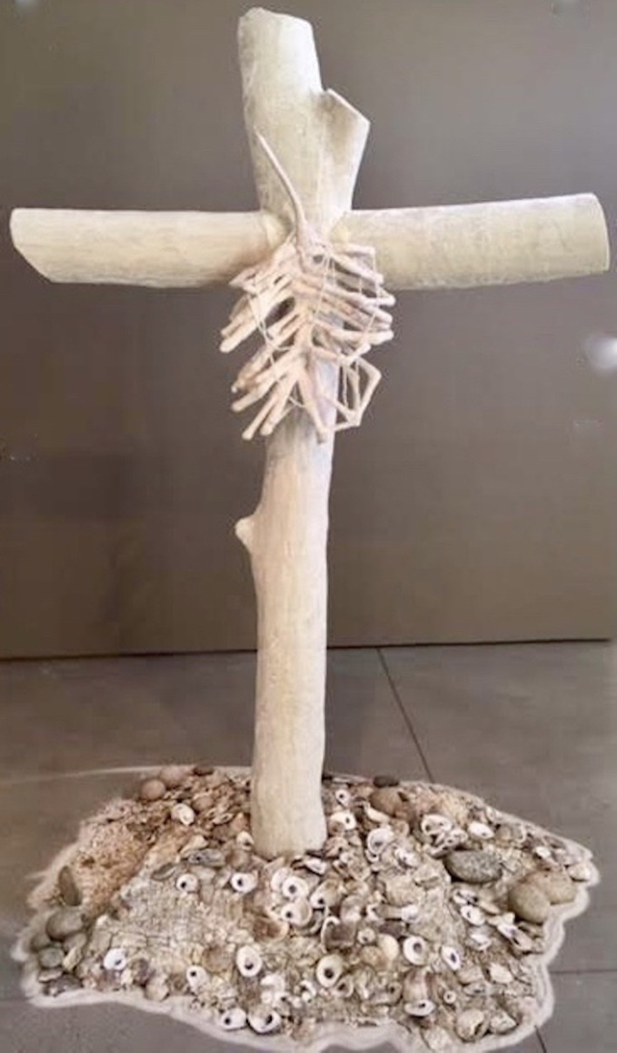 Previous Image Next Image Future Icon, group exhibition, working eries, Crucifixion of the Divine Feminine. Velvet skinned tree with painted mud and oyster shell, 2018