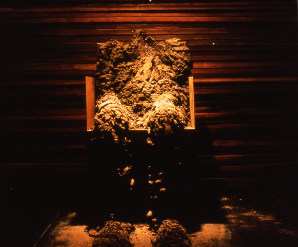 Previous Image Next Image Systems Within window installation – detail of the mudman, eroding. 1991 Systems Within – detail