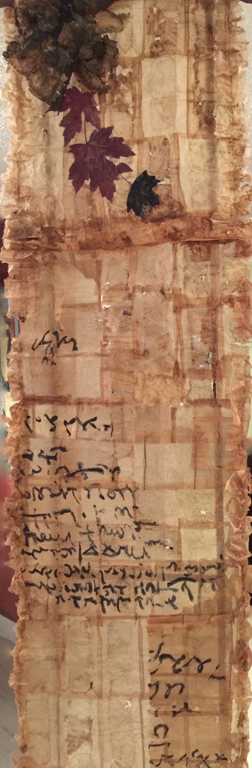 Previous Image Next Image Time in Material installation, group exhibition, tea paper. – detail of The Gospel According to Mary Magdelen